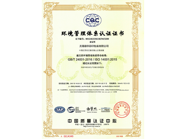 环境管理体系认证证书