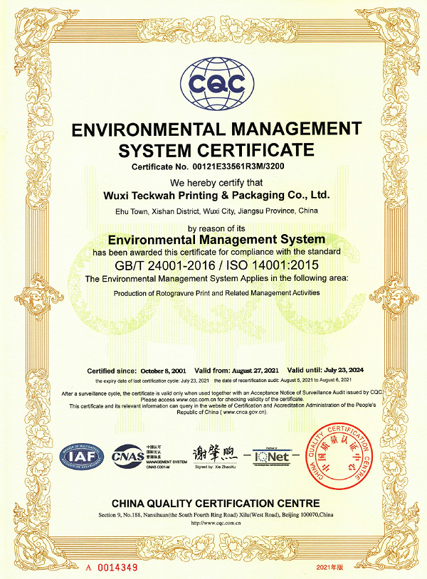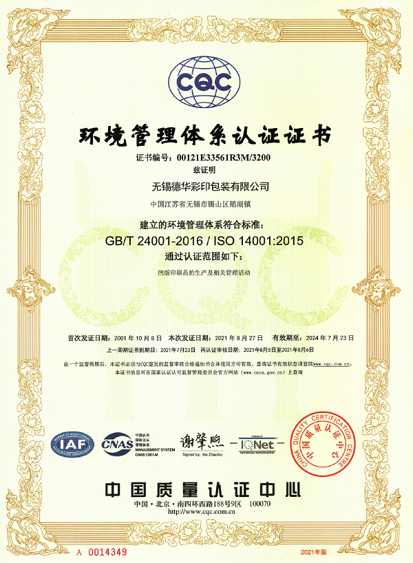 环境管理体系认证证书
